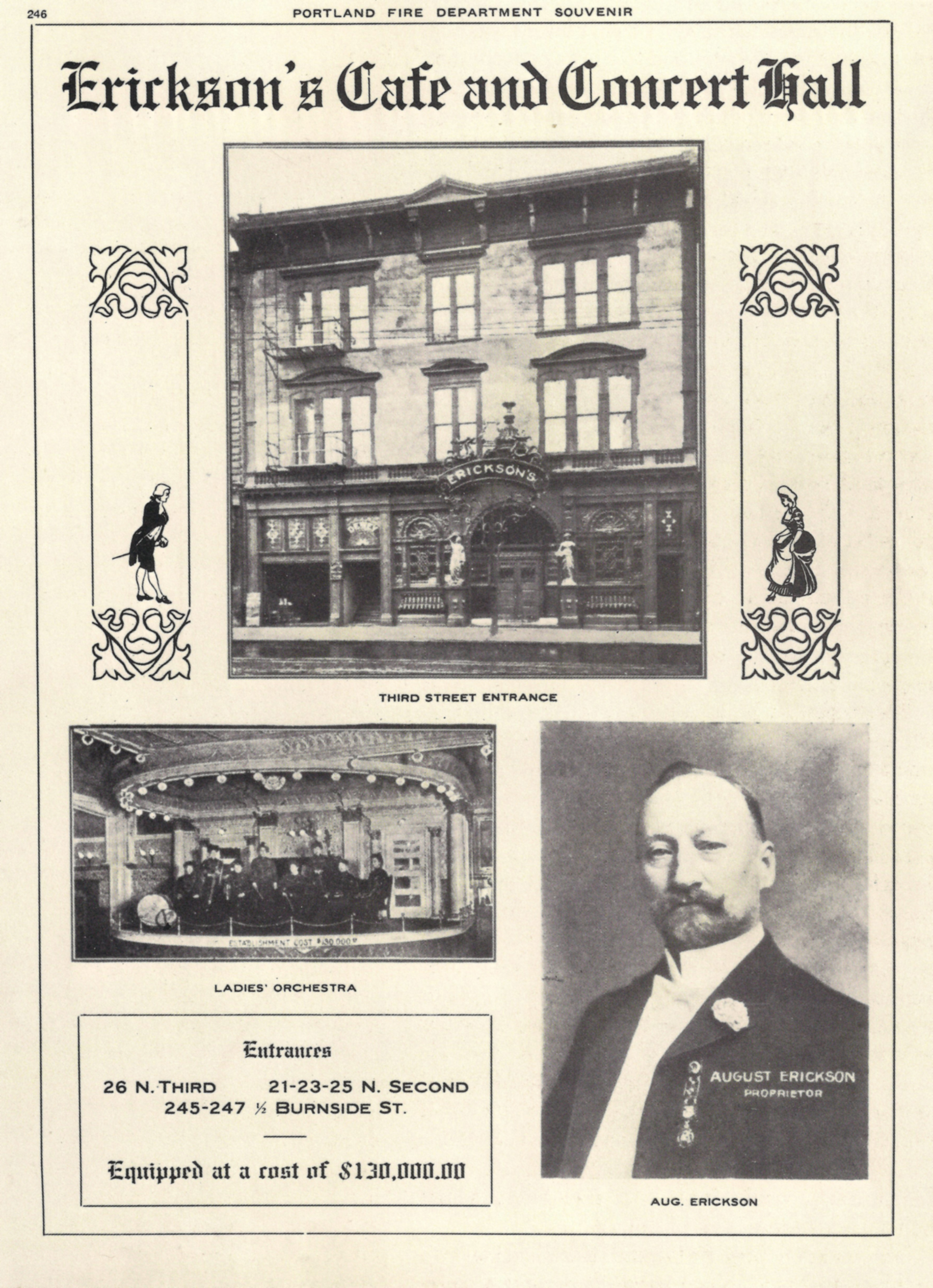 An advertising flyer for the newly remodeled Erickson's Saloon, the famous loggers' watering hole at Second and Burnside in the North End, in the late 1890s.