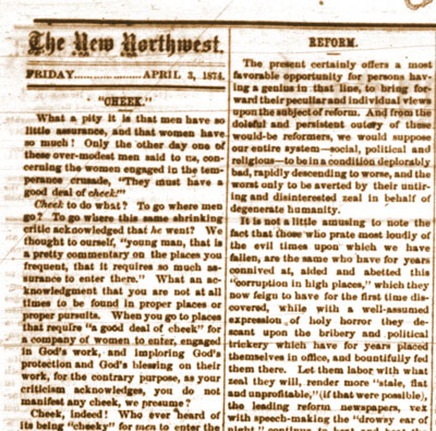 In Portland, the mainstream newspapers — there were three of them at the time: the Morning Oregonian, the Portland Bulletin and the Evening Telegram — mentioned these events only briefly and occasionally. But Abigail Scott Duniway, editor and publisher of The New Northwest, was very interested. Readers of her weekly paper, mostly women, were kept very much up to date on the temperance movement.