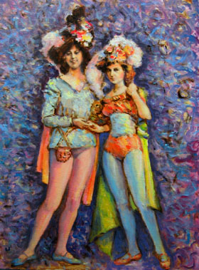 Variety theater dancers, 1901: Two Vaudeville girls getting ready to go on stage in a variety theater in Alaska during the Yukon Gold Rush. The woman on the left is "Klondike Kate" Rockwell, later a Central Oregon legend. (Oil painting by Leland John of Oregon City.)