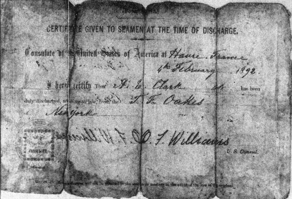 Clark's discharge papers issued after he left the employ of the T.F. Oakes in Le Havre, France, in early 1892. Clark treasured this document, although it had clearly had as rough a life as he. (Here's another link to the entire story, from Stewart Holbrook's four-part series in the Portland Morning Oregonian.) (Image: Portland Morning Oregonian, Oct. 29, 1933)