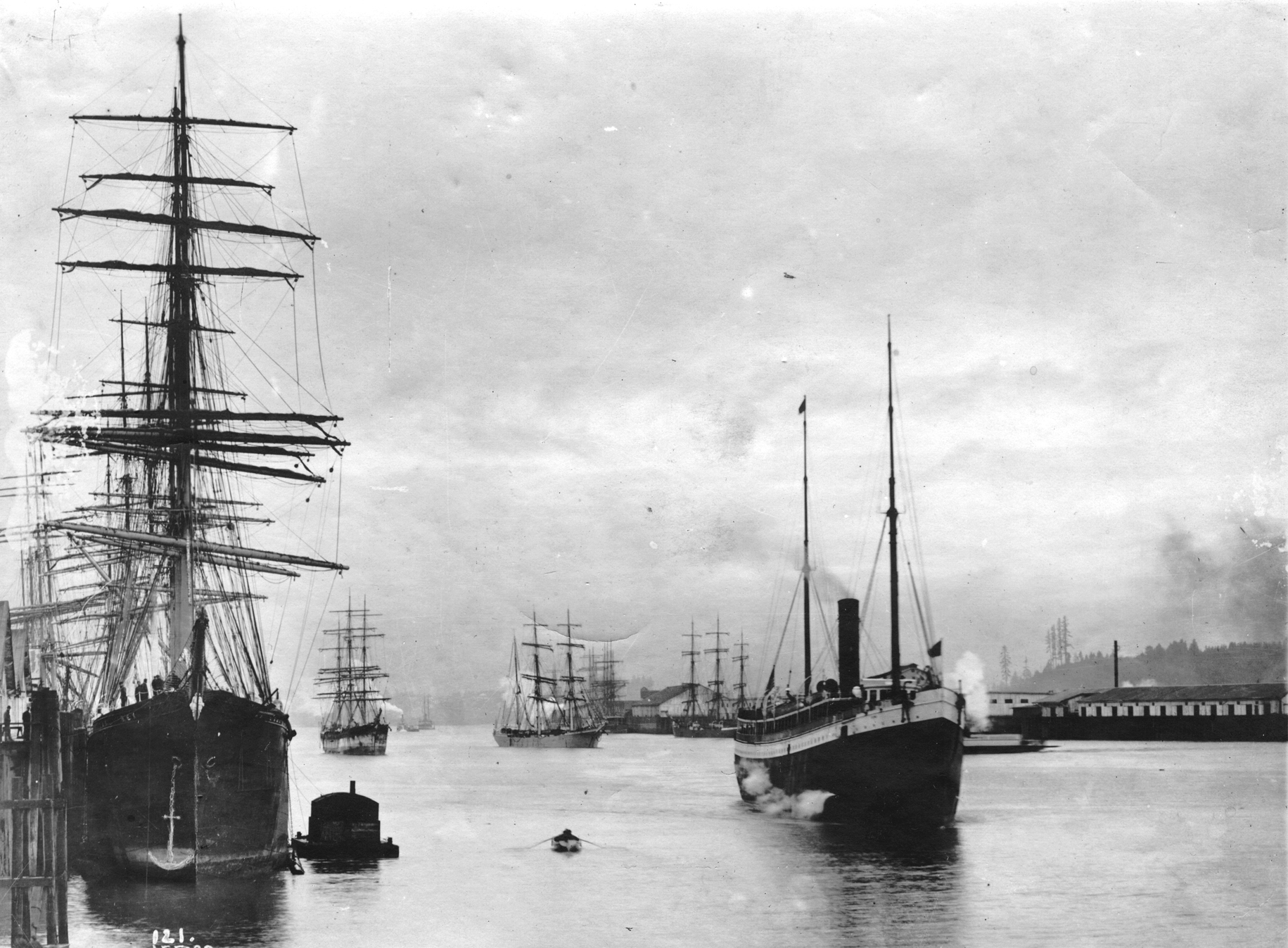 A busy day in Portland's harbor. Judging by the ratio of sailing ships to steam vessels, this looks to have been made in the late 1890s or possibly the early 1900s. Either way, it's a sure thing the captain of every one of the ships you see in this picture knew who Larry Sullivan was. (Image: OSU Archives)